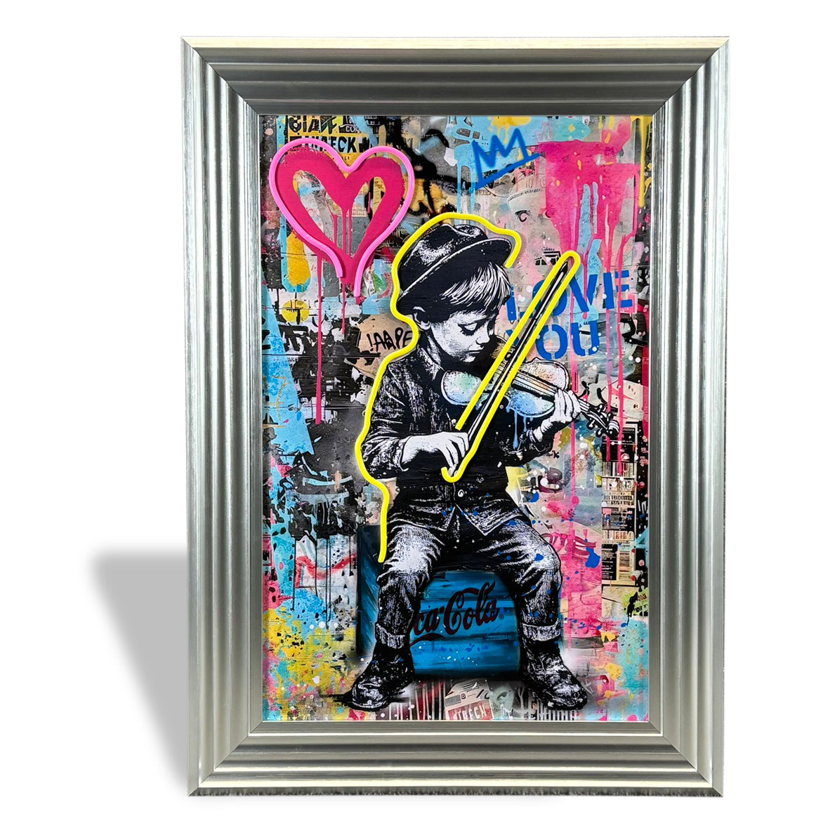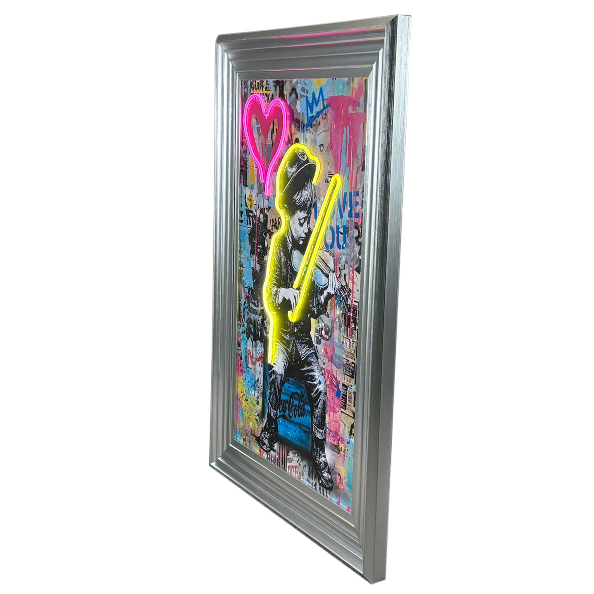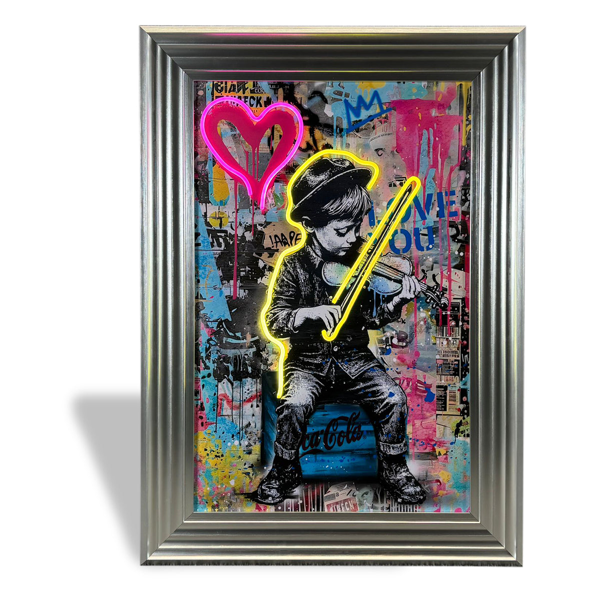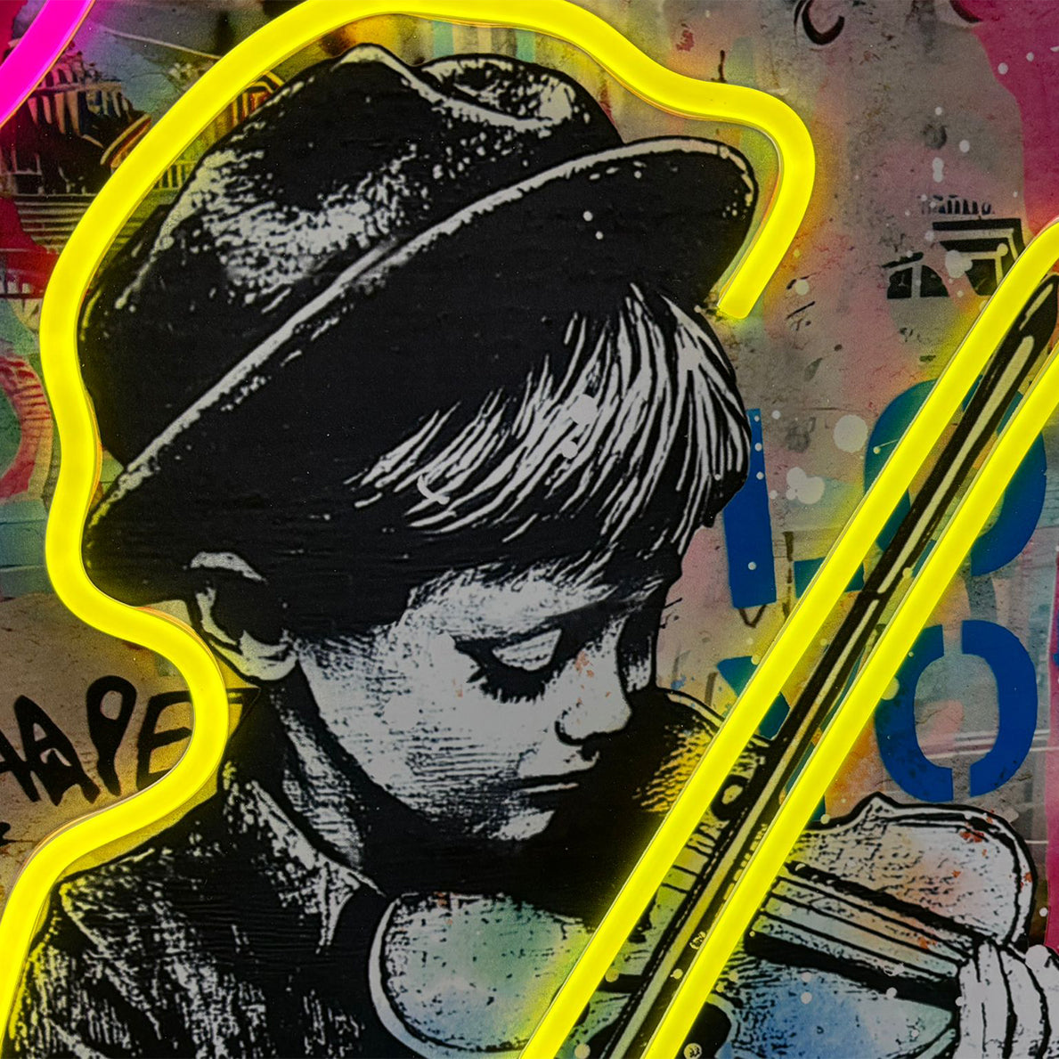 A young street musician sits quietly on a crate, bow in hand, drawing out a melody only he can fully hear. The graffiti-soaked wall behind him erupts with colour and movement, yet his focus never shifts — a small moment of calm and tenderness against the chaos of the city. A glowing neon outline wraps around him, a soft reminder that even the smallest notes can light up their surroundings.