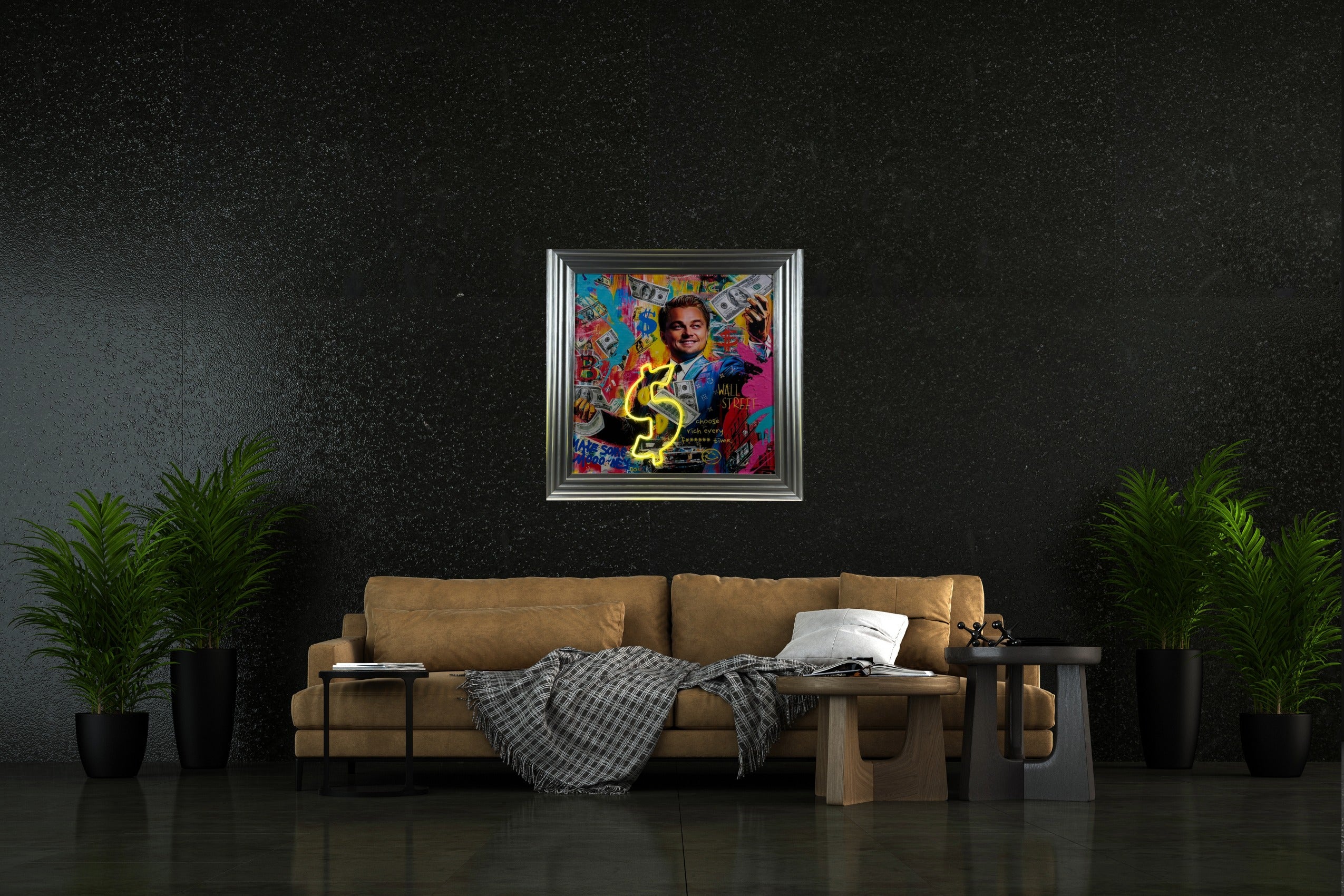 A brand-new silver-framed LED wall art piece titled Money Never Sleeps, inspired by the fast-paced world of Wall Street and modern wealth culture. This striking artwork features a colourful, high-impact portrait set against a layered graffiti backdrop, with floating currency motifs and a vibrant neon LED dollar sign at the centre, bringing the piece to life both day and night.