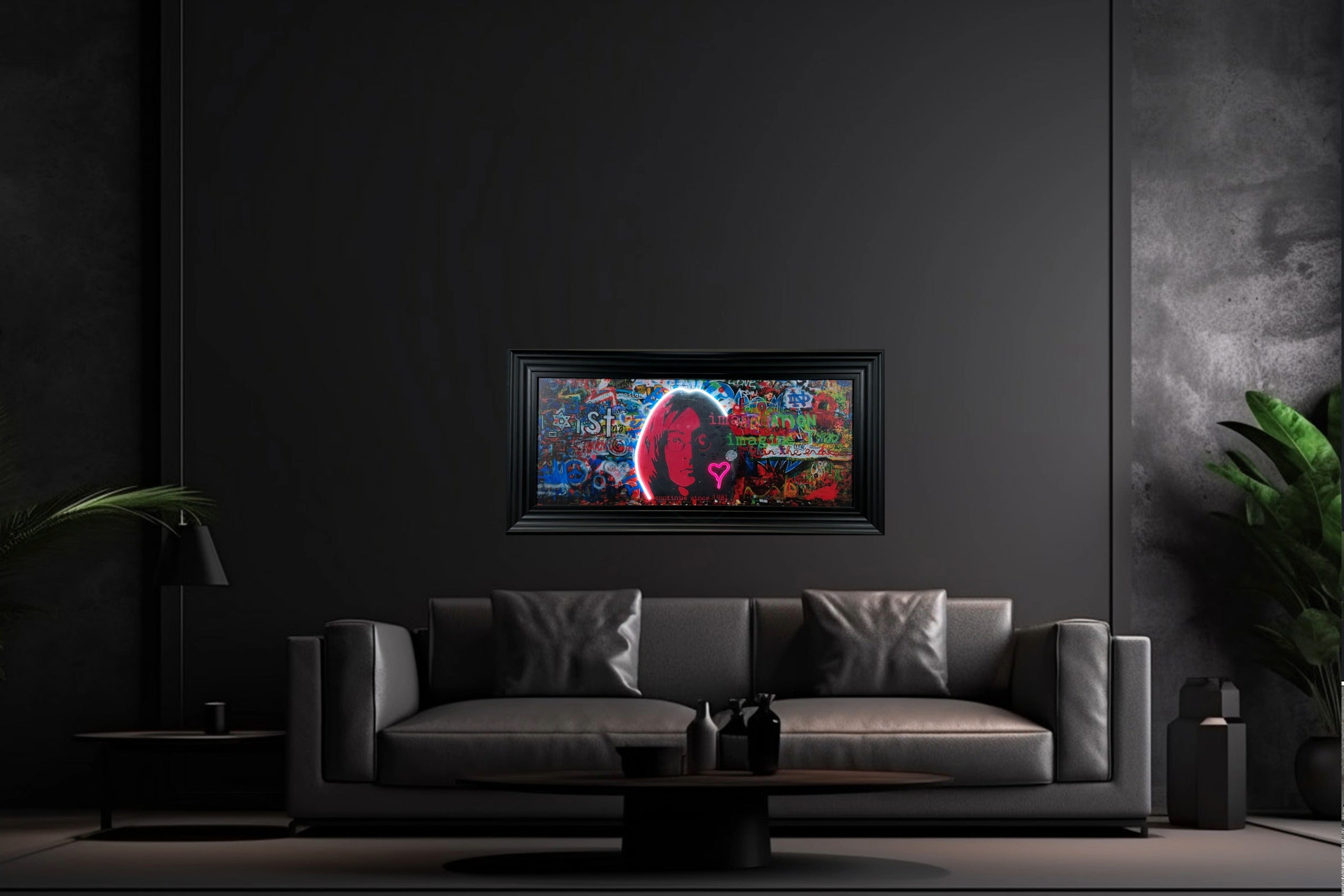 Imagine Peace is a striking LED wall art piece that blends iconic portraiture with layered street-art textures and neon illumination. The artwork features a bold, graffiti-inspired backdrop filled with expressive colour, symbolism and handwritten elements, brought to life by a soft white LED halo and a subtle pink neon heart that adds warmth and emotional focus to the composition. The lighting enhances depth without overpowering the artwork, creating a calm yet powerful visual statement.