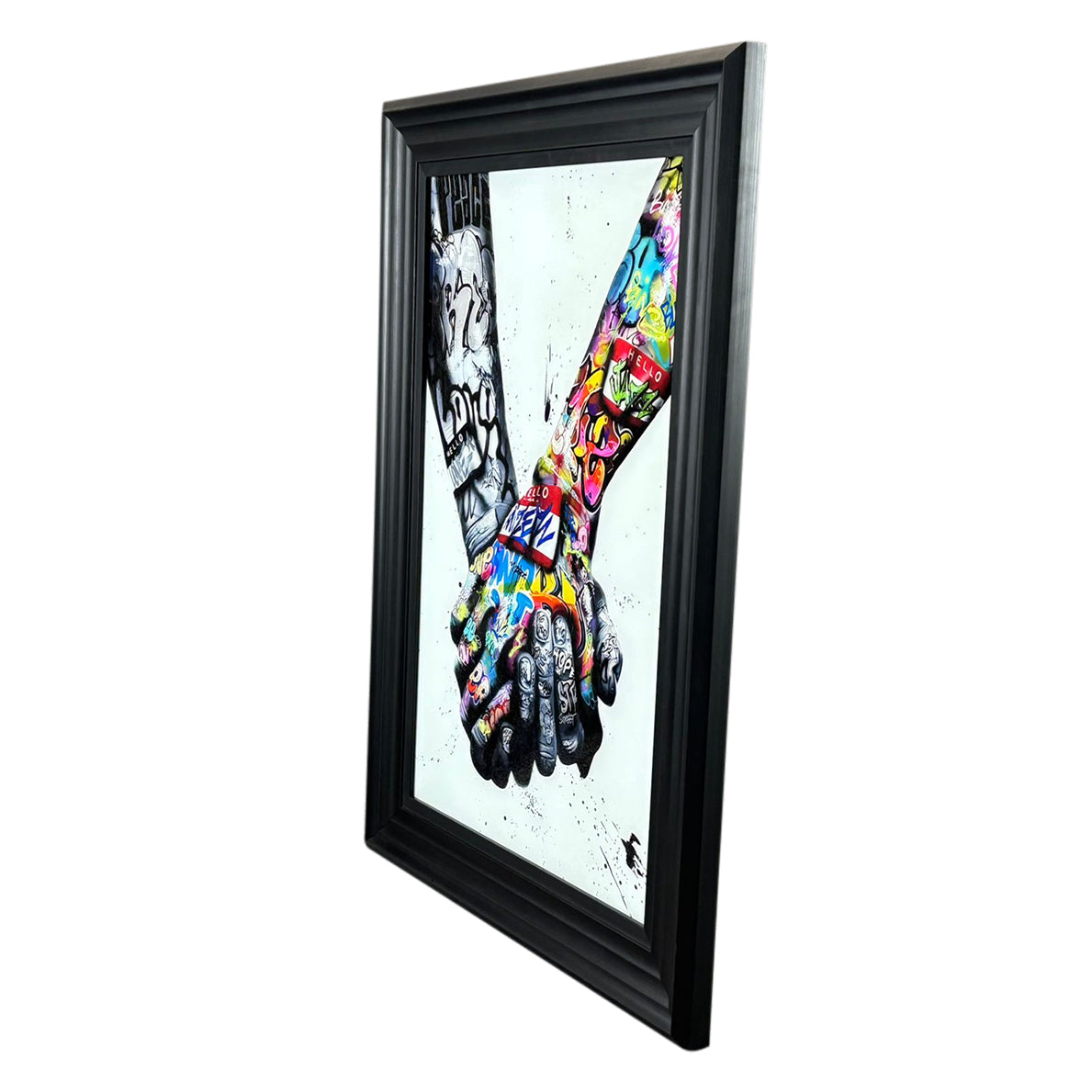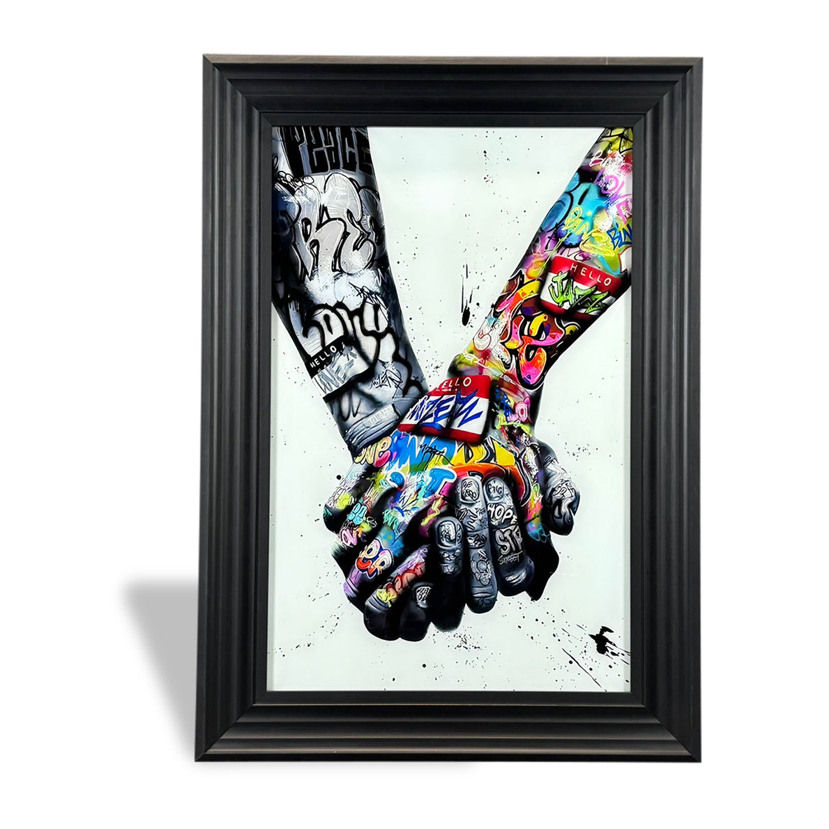 Together We Stand is a striking liquid art piece that symbolises unity, connection, and strength in togetherness. The artwork features two hands locked in solidarity, layered with vibrant graffiti-style detail that contrasts raw emotion with contemporary street art influence. The result is a powerful visual statement that feels both modern and meaningful.