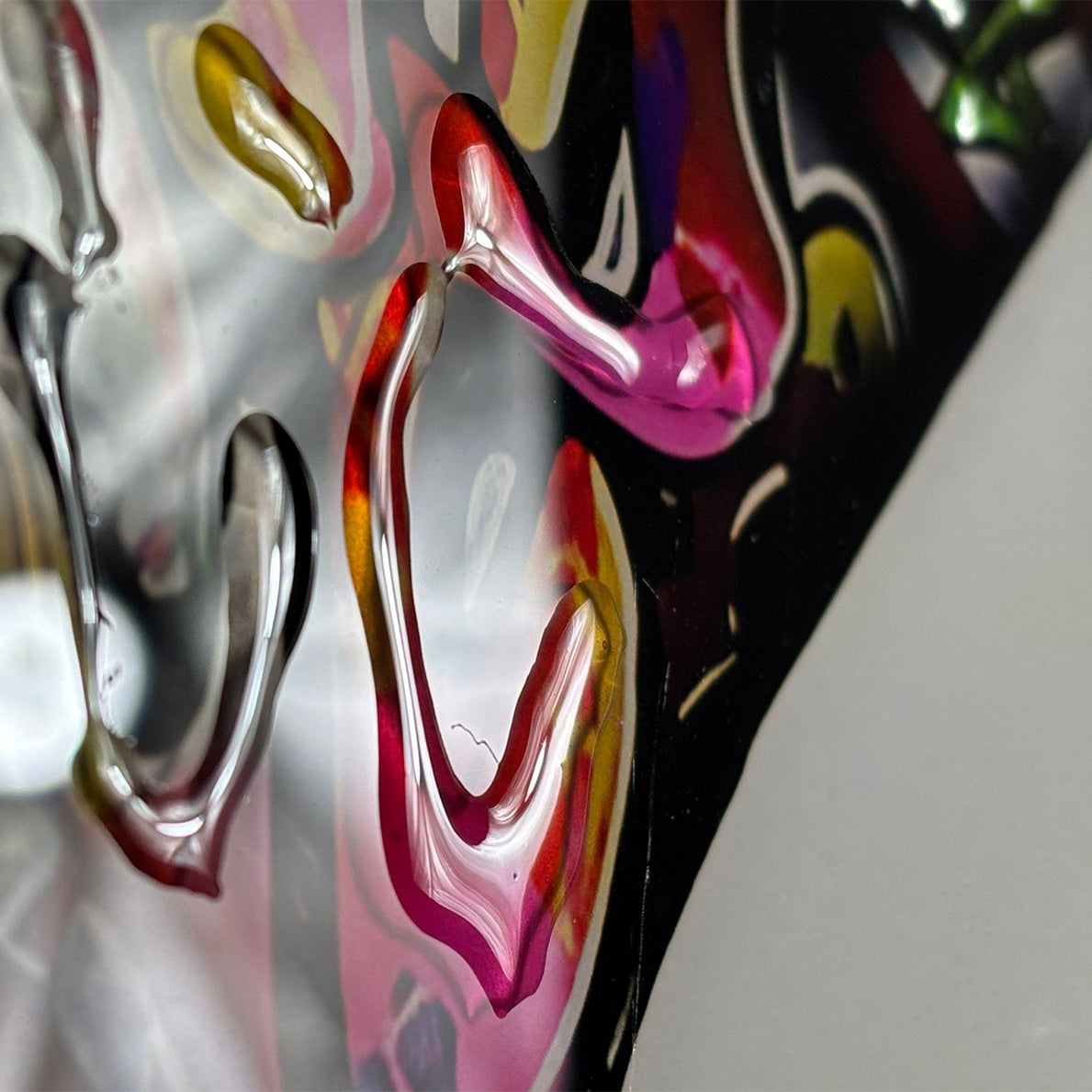 This piece is created using liquid art applied directly onto high-tempered glass, giving the artwork a high-gloss finish with exceptional depth, clarity, and colour vibrancy. The glass surface enhances the layered textures and ensures a premium, durable presentation.