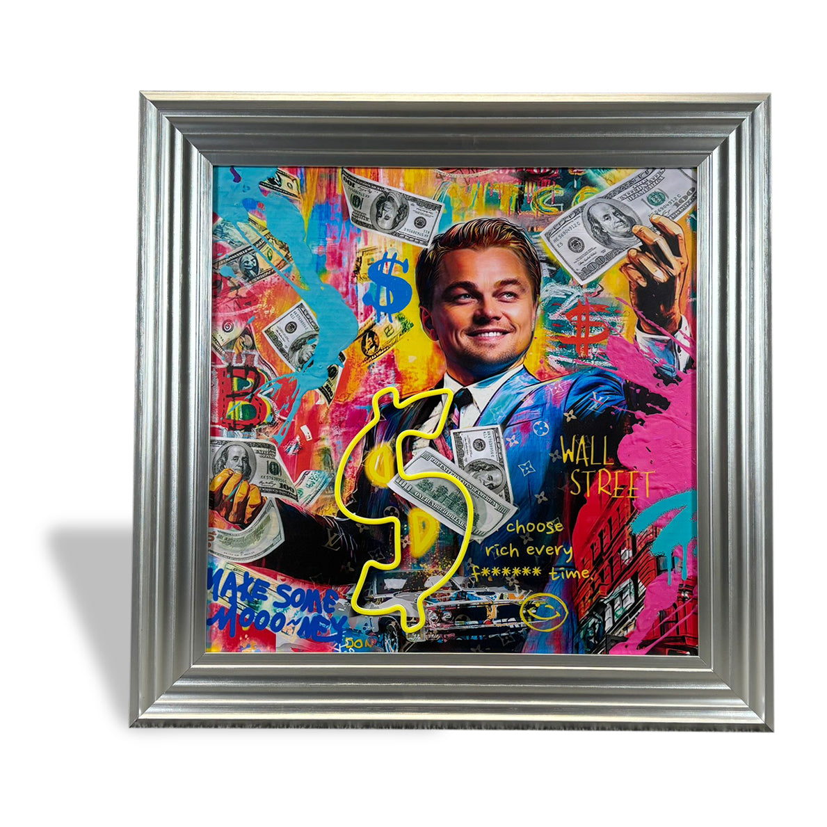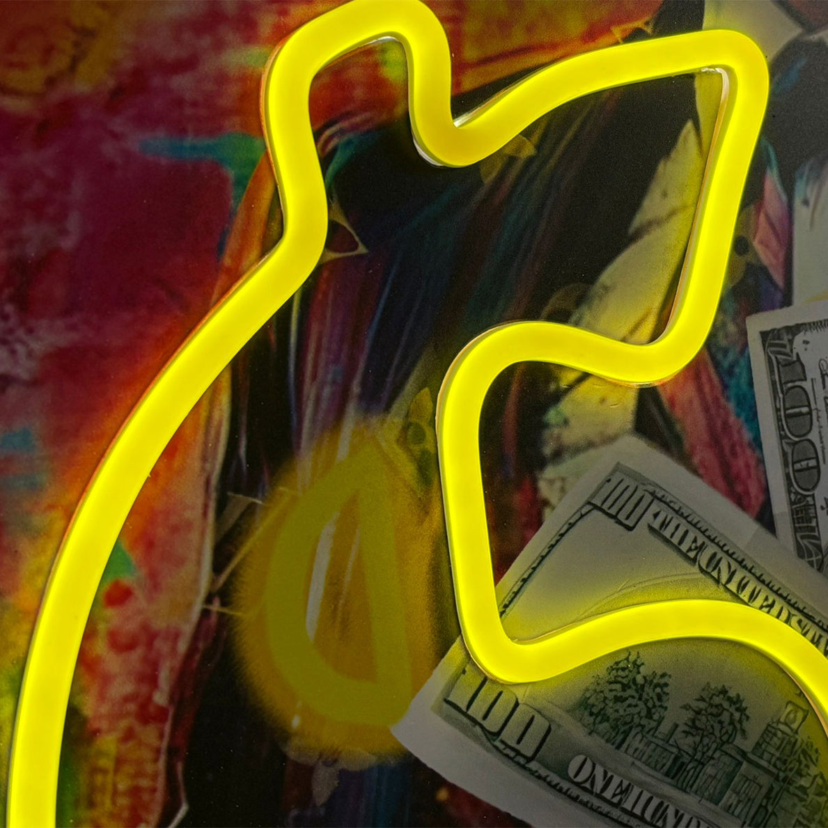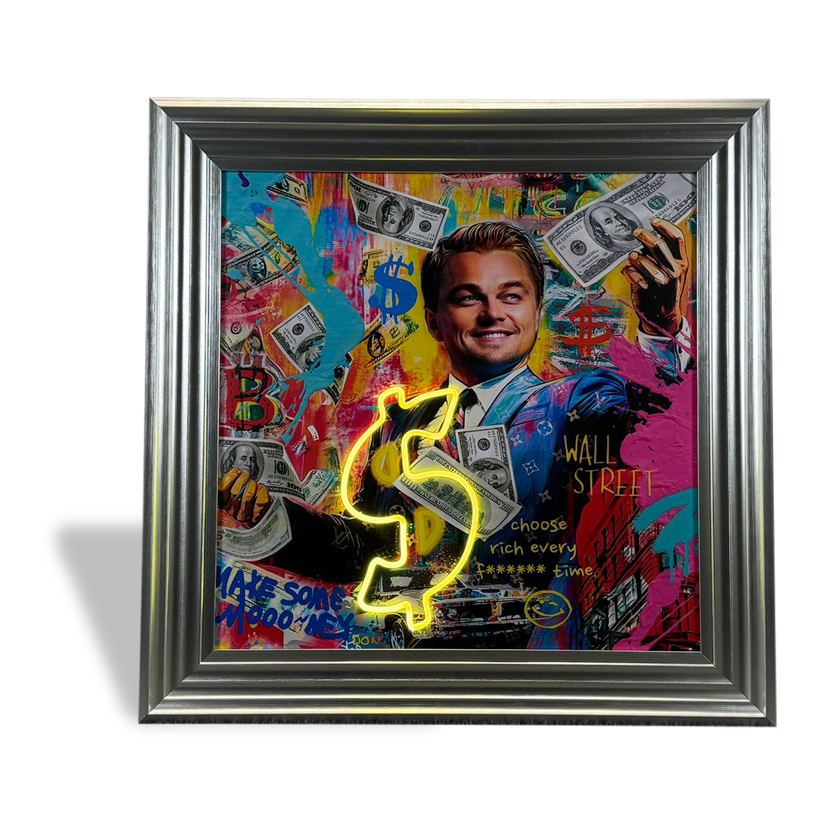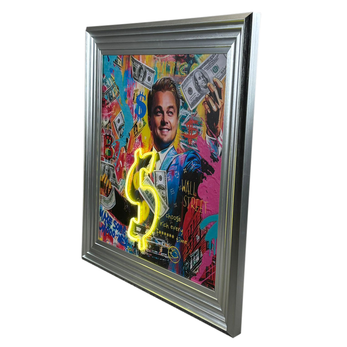 A brand-new silver-framed LED wall art piece titled Money Never Sleeps, inspired by the fast-paced world of Wall Street and modern wealth culture. This striking artwork features a colourful, high-impact portrait set against a layered graffiti backdrop, with floating currency motifs and a vibrant neon LED dollar sign at the centre, bringing the piece to life both day and night.