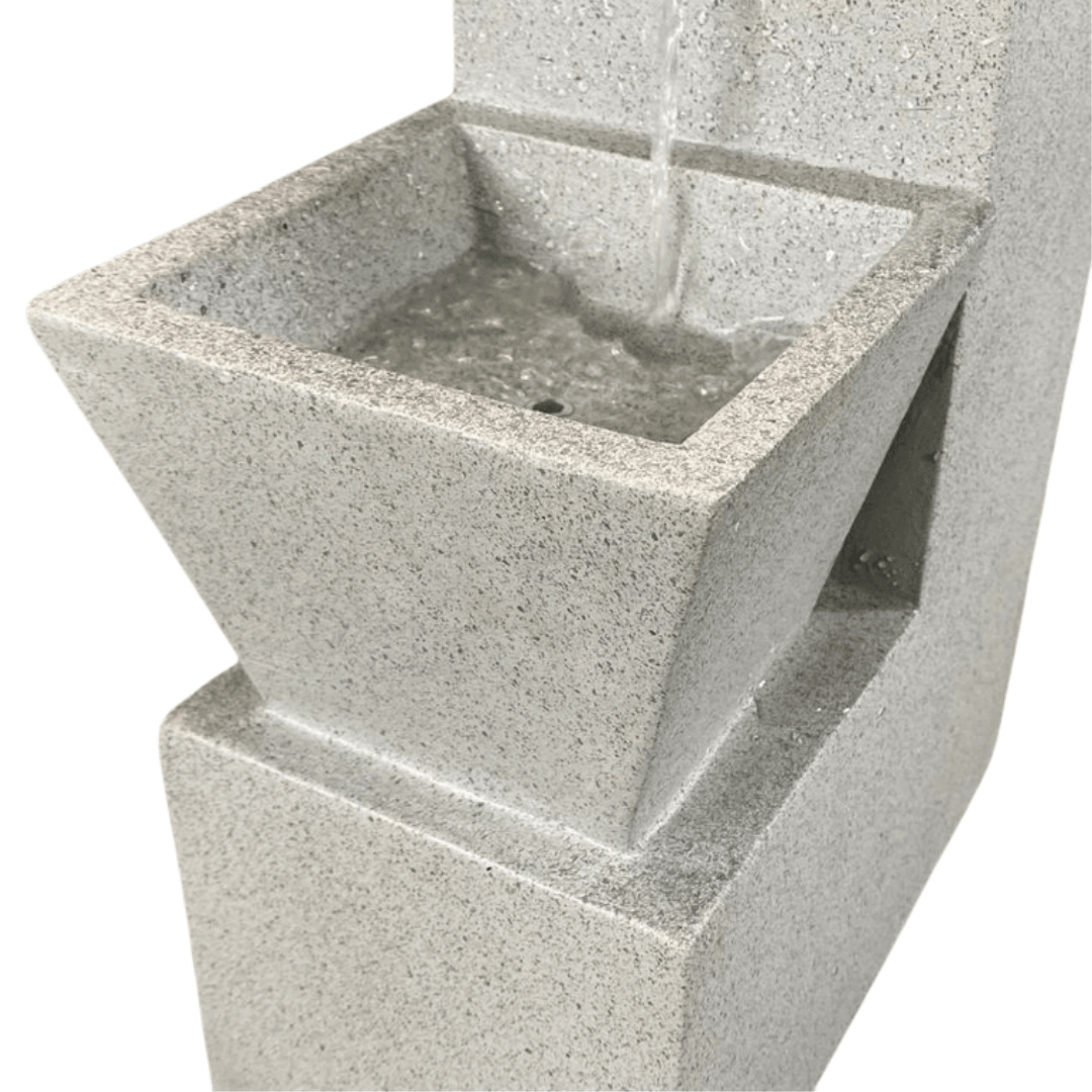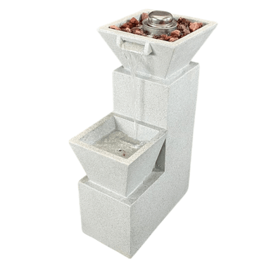 This elegant two-tier water fountain is crafted in a light grey finish, offering a modern and minimalistic design. It features an oil burner with lava rocks at the top, creating a soothing, relaxing ambience as water flows down from the upper tier to the lower basin. The fountain is suitable for both indoor and outdoor spaces and is perfect for enhancing your living area, garden, or patio. With its sleek design, it will be a standout piece in any environment.