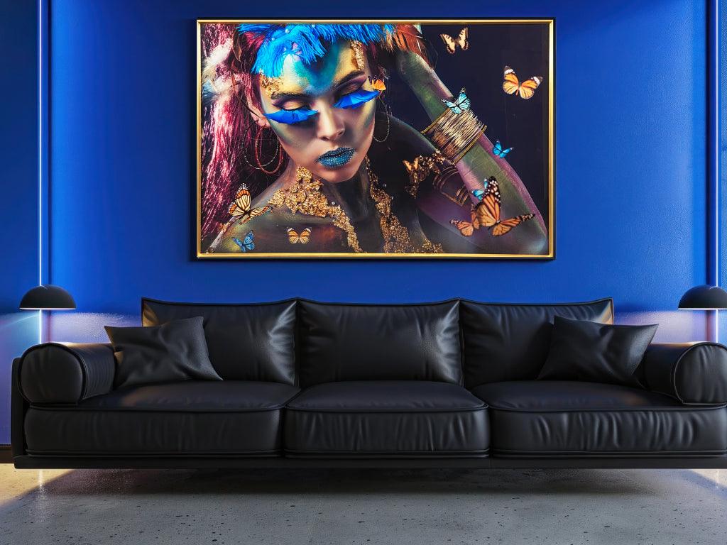 This mesmerizing glass art picture captures the ethereal beauty of a mystical lady surrounded by a flutter of colourful butterflies. The lady, depicted with an aura of mystery and grace, is the focal point, her serene presence enhanced by the delicate butterflies that dance around her in a vibrant array of colours. Each butterfly is intricately detailed, adding a sense of life and motion to the scene. The glass medium allows for a stunning play of light, bringing out the vivid hues and fine details with remarkable clarity. Crystal embellishments are elegantly incorporated, adding a subtle sparkle that accentuates the magical atmosphere of the composition. The artwork is enclosed in a luxurious gold frame, which complements the richness of the colours and adds a touch of opulence. Measuring 80cm in height and 120cm in width, this piece is a breathtaking statement of elegance and enchantment, perfect for any sophisticated space.