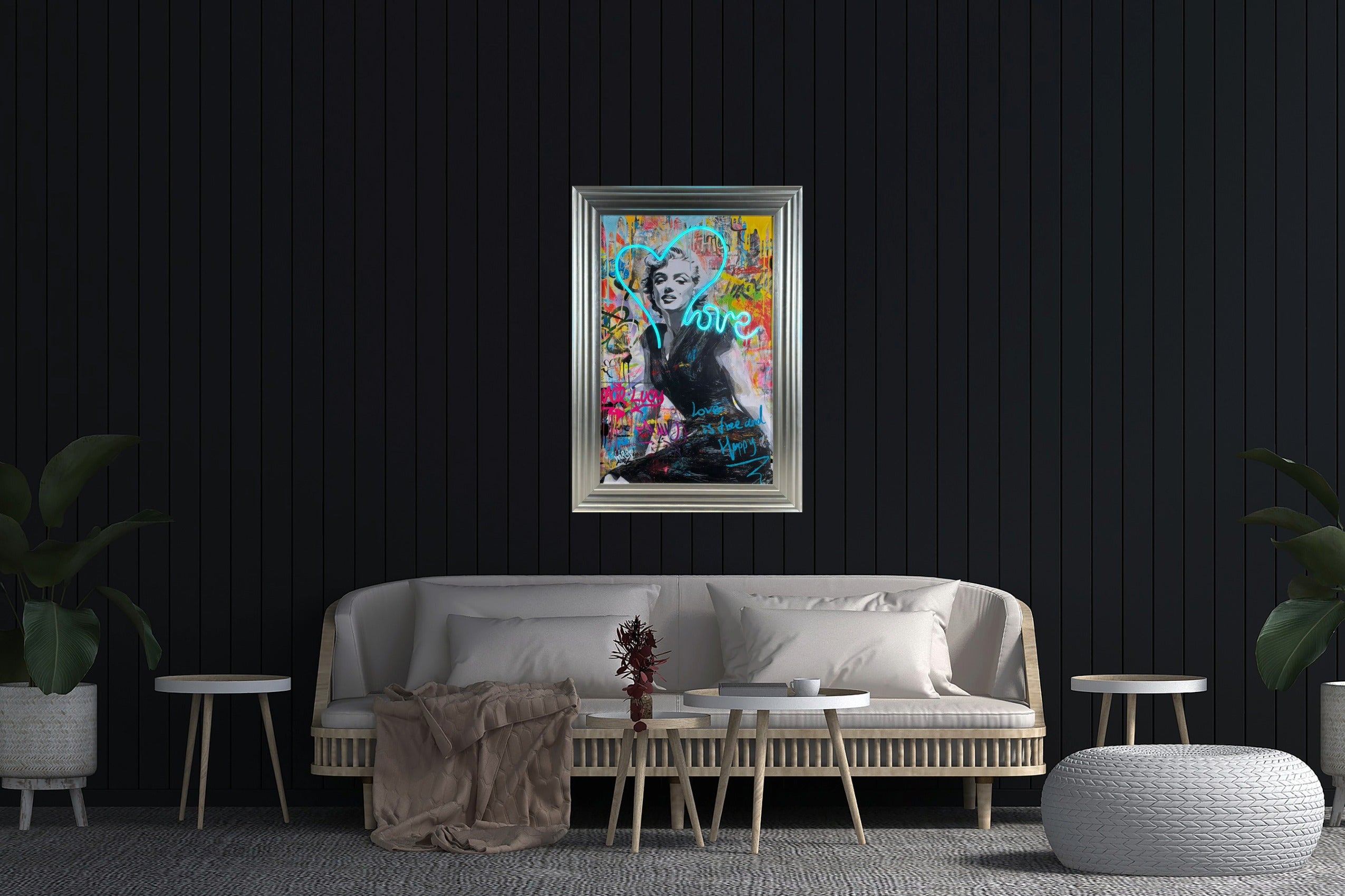 This striking LED wall artwork captures a timeless icon through a bold graffiti-inspired composition, blending classic elegance with modern urban expression. Set against a richly textured backdrop of layered colour and street-style markings, the portrait is elevated by a glowing neon heart and flowing “love” script, which bring warmth, emotion, and movement to the piece.