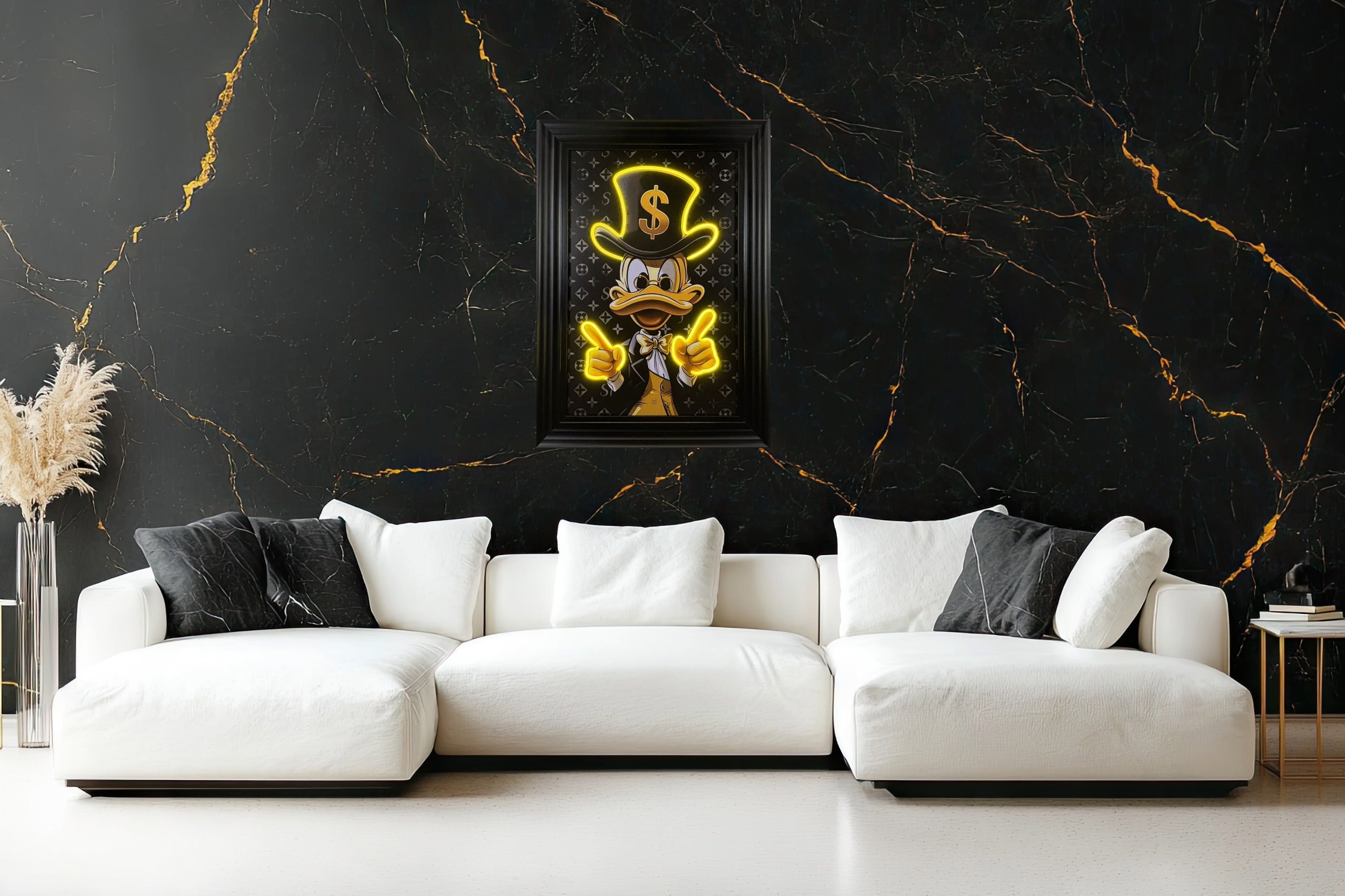Scrooge steps forward with unmistakable confidence, dressed in gold tones and surrounded by a luxury-inspired backdrop that speaks volumes without saying a word. His pose is bold, his expression assured, and the neon glow sharpens a character long associated with wealth, ambition, and success. This piece isn’t about excess — it’s about mindset.