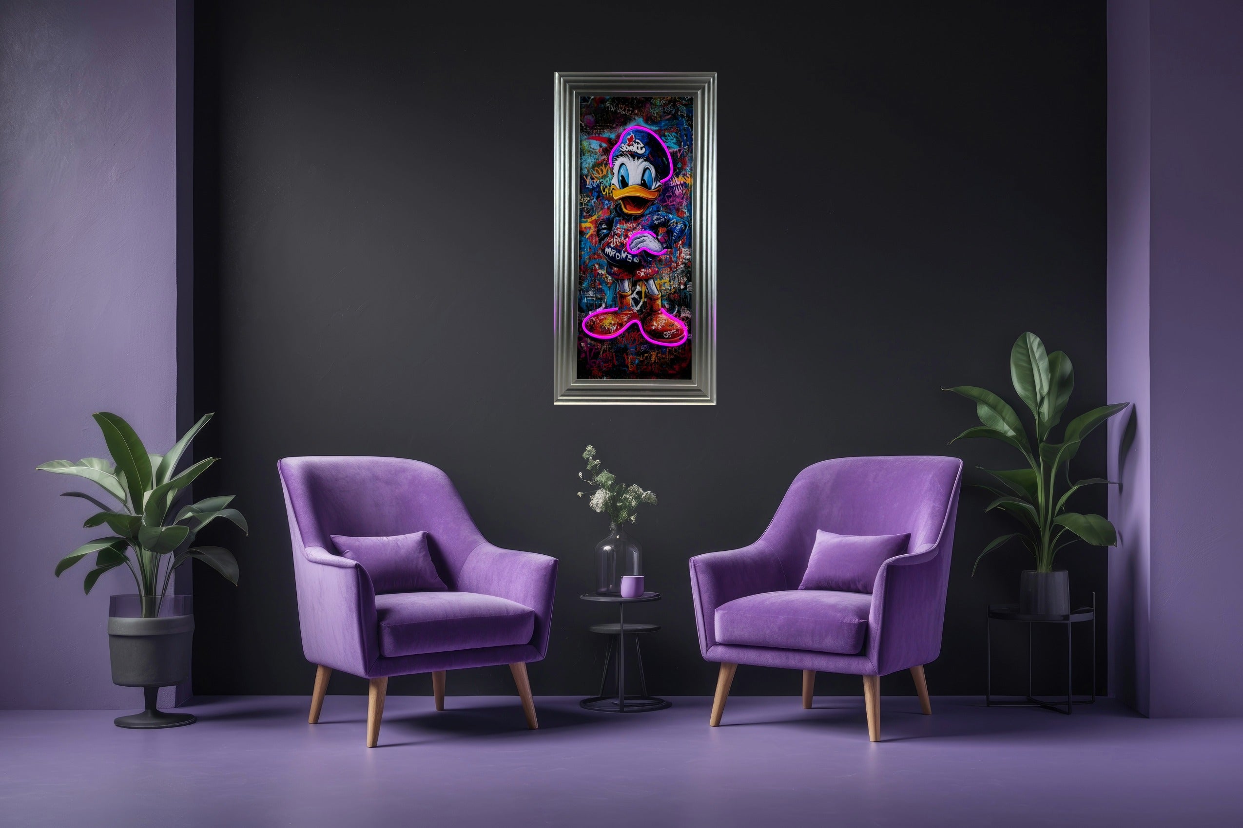Donald steps out of the classic cartoon world and straight into a graffiti-soaked alleyway, carrying all the attitude and colour of the streets with him. His expression is bold, his stance unapologetic, and the neon outline gives him a modern edge, turning the familiar character into a standout piece of urban art. It’s playful, rebellious and packed with personality.