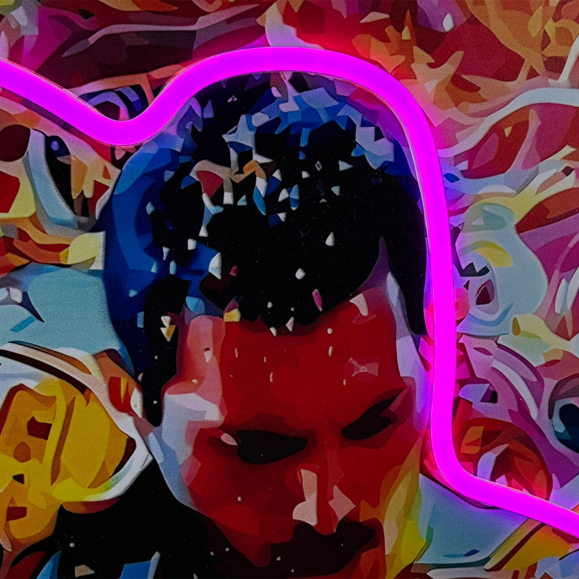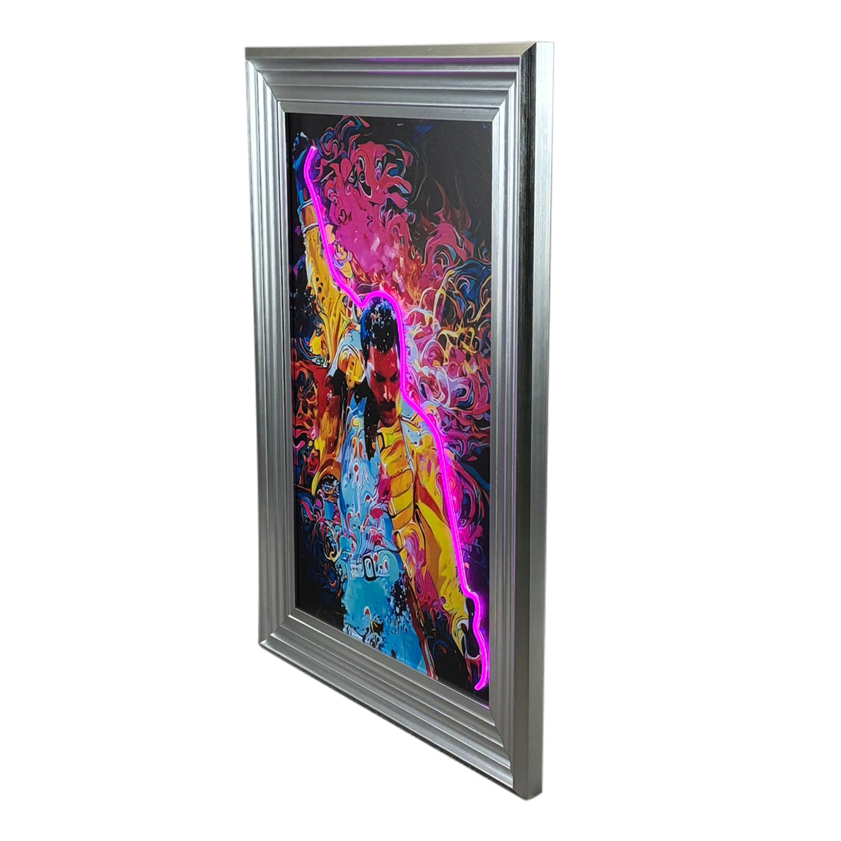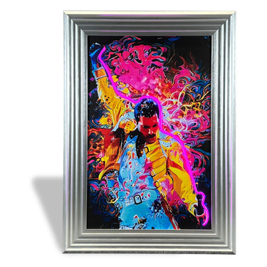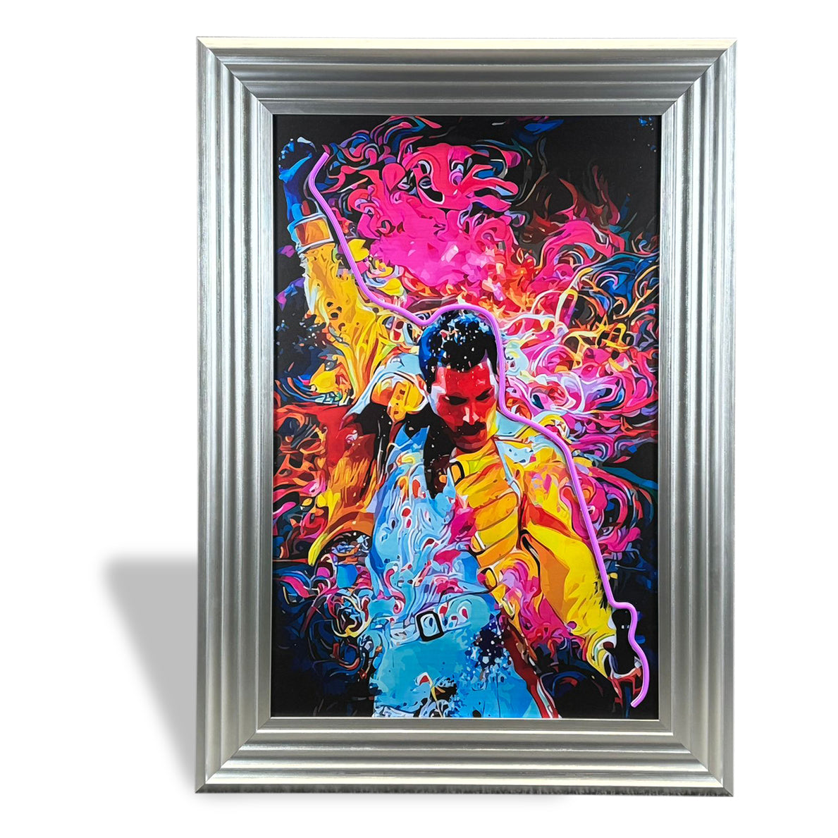 Freddie always had a way of turning a single moment into pure electricity — and here, that magic is frozen in full colour. His iconic yellow jacket cuts through a storm of radiant swirls, neon light traces his silhouette, and the whole scene erupts with the same unstoppable energy he carried onto every stage.
