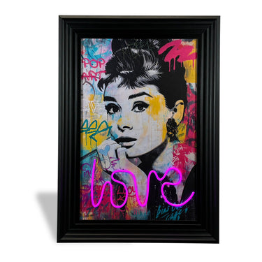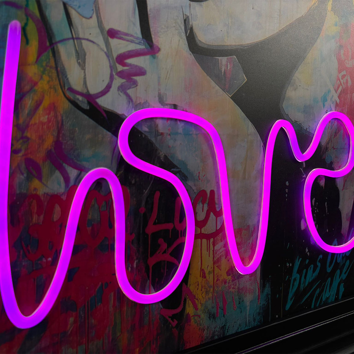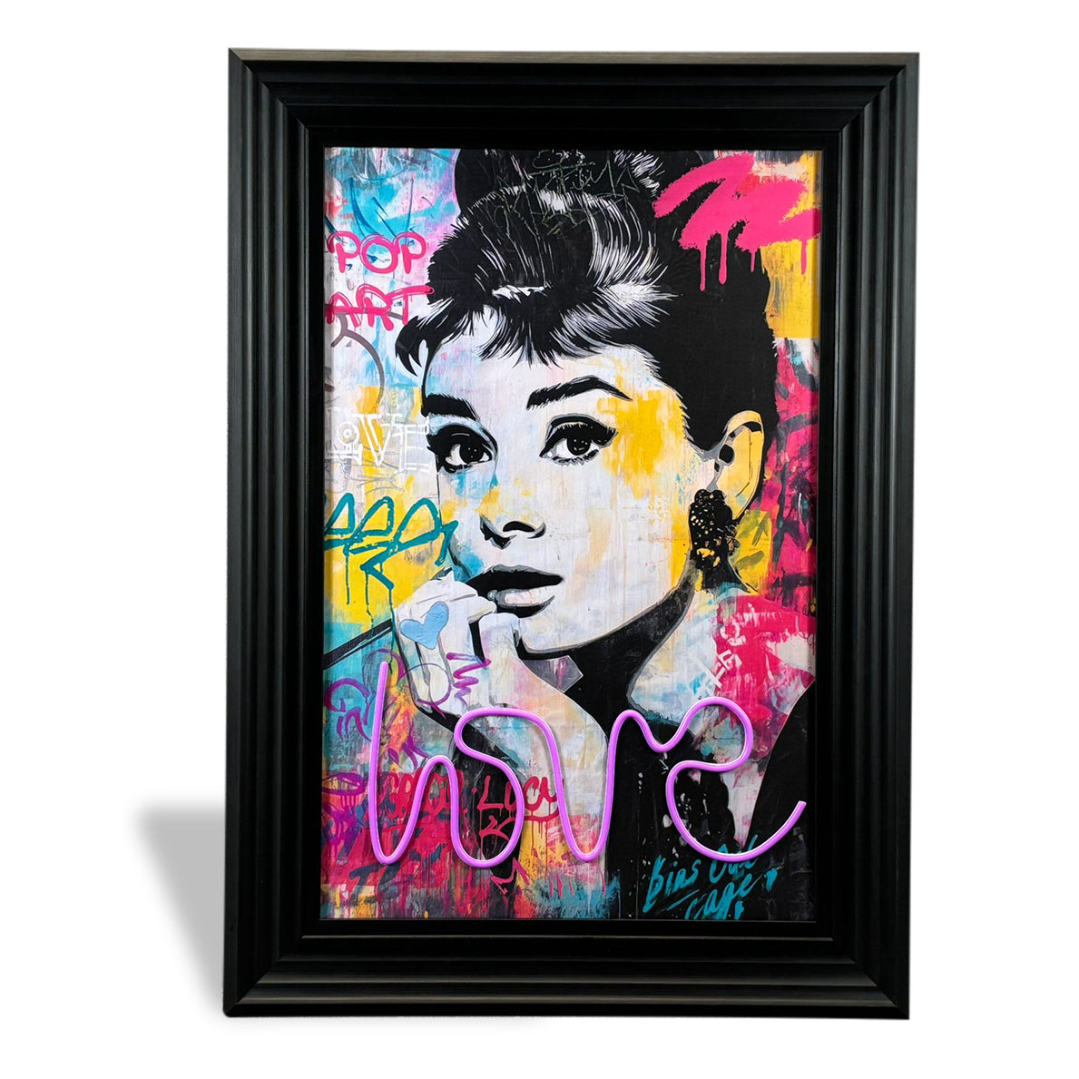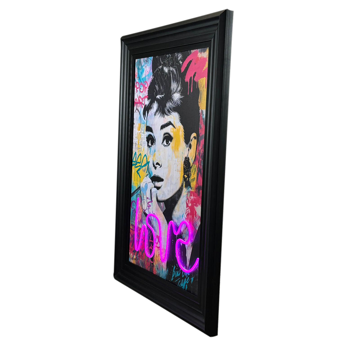 Love Looks Like Audrey captures timeless elegance through a modern, street-art lens. This striking LED wall art reimagines Audrey Hepburn with a bold graffiti backdrop, blending classic beauty with contemporary edge. The neon pink “love” script glows softly across the artwork, adding warmth, attitude, and visual impact without overpowering the portrait.