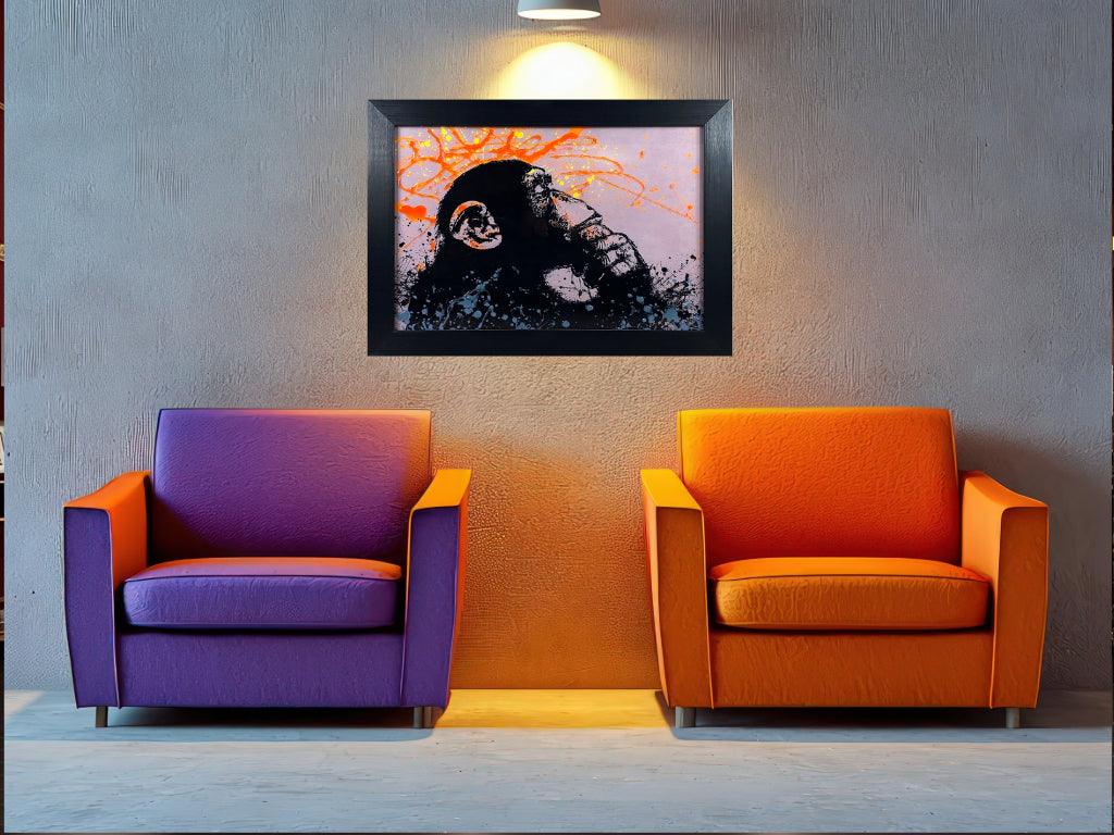 Introducing "The Thinker Monkey," a striking piece by Banksy that masterfully blends street art with thought-provoking imagery. Deep in thought, this artwork features a contemplative monkey with vibrant splashes of orange surrounding its head, symbolising a burst of creativity or an epiphany. The juxtaposition of the animalistic figure in a human-like pose challenges viewers to reflect on the nature of thought, intelligence, and evolution.